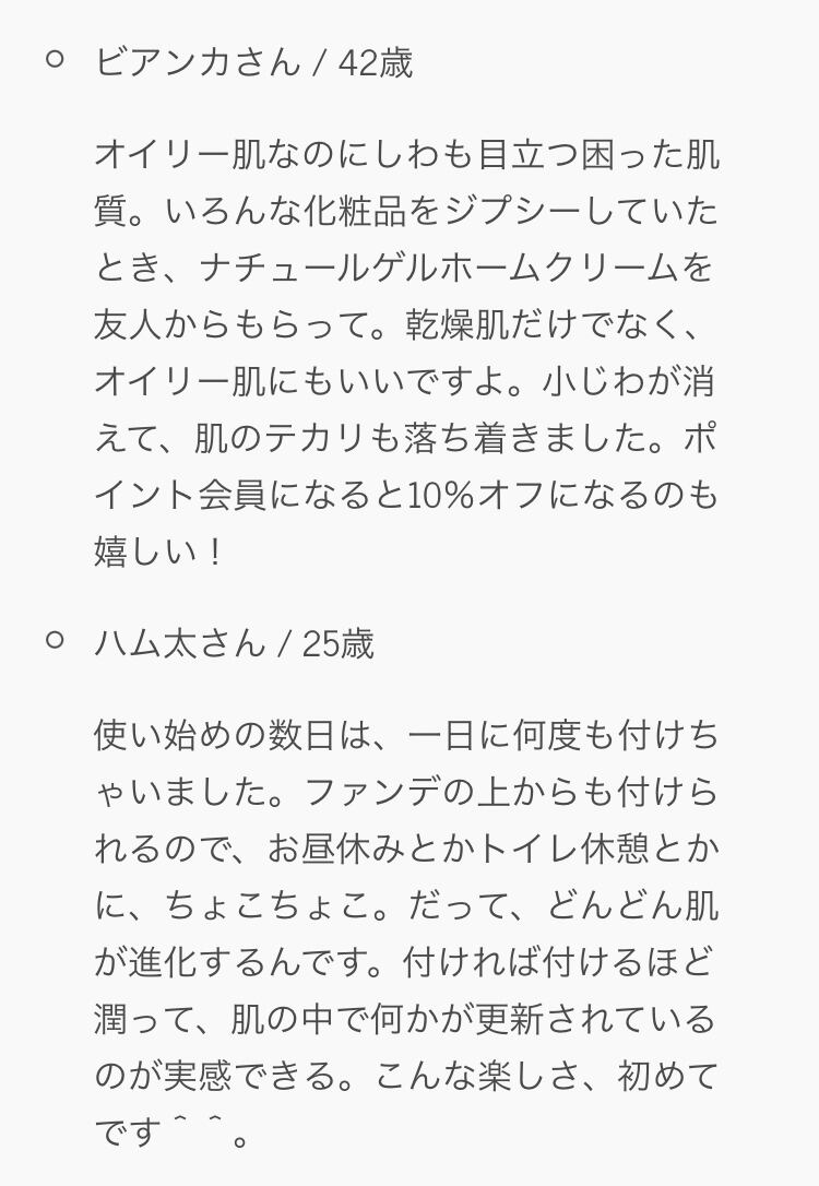『浸透力&保湿力』に優れた 14 種類のナチュラル感にこだわった成分を厳選配合。肌に 必要なやさしい成分だけをたっぷりチャージした肌は理想的なしっとりうるおい素肌へ。 洗顔後の素肌にこのゲルホームクリーム 1 つで保湿ケアが完了します。