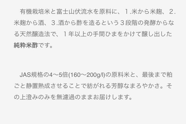 有機栽培米コシヒカリと富士山伏流水バナジウム水を原料に醸し出した純米酢を、澱引き剤や濾過剤などの助剤を一切使用せず、『本来の風味豊かさ』をそのまま瓶詰めしました。