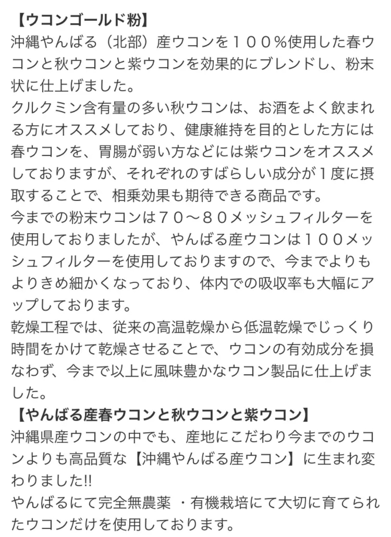 農薬不使用栽培、沖縄県産の3種ウコン100%です。日々の美容健康にお役立てください。